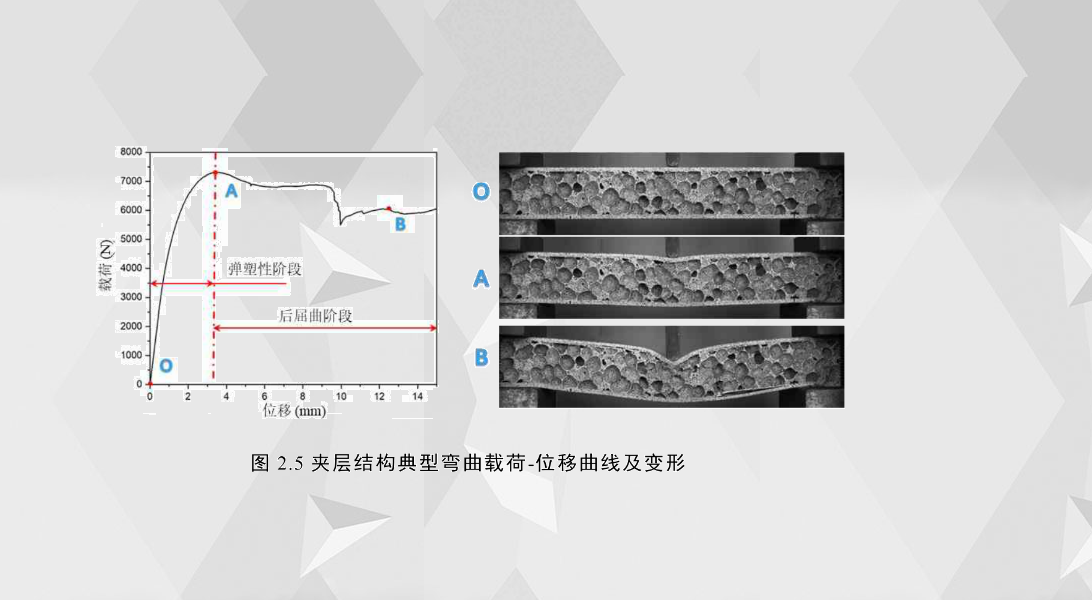 2.3失效模式和結(jié)構(gòu)響應(yīng)圖2.5是泡沫鋁夾層結(jié)構(gòu)彎曲試驗(yàn)典型的載荷-位移曲線和試件在三個(gè)特定位置的變形、破壞圖。根據(jù)載荷-位移曲線的初始拐點(diǎn)和變形、破壞程度,可將載荷-位移曲線分為兩個(gè)階段,兩個(gè)階段的臨界點(diǎn)位移對(duì)應(yīng)的載荷稱為臨界失效模式的臨界載荷。第一階段為彈塑性階段,從O到A,此階段夾層結(jié)構(gòu)主要發(fā)生彈性變形,載荷與位移呈近似線性增長(zhǎng)關(guān)系;第二階段為初始拐點(diǎn)至最終破壞,稱為后屈曲階段,此階段夾層結(jié)構(gòu)的局部或者整體發(fā)生明顯變形、破壞。