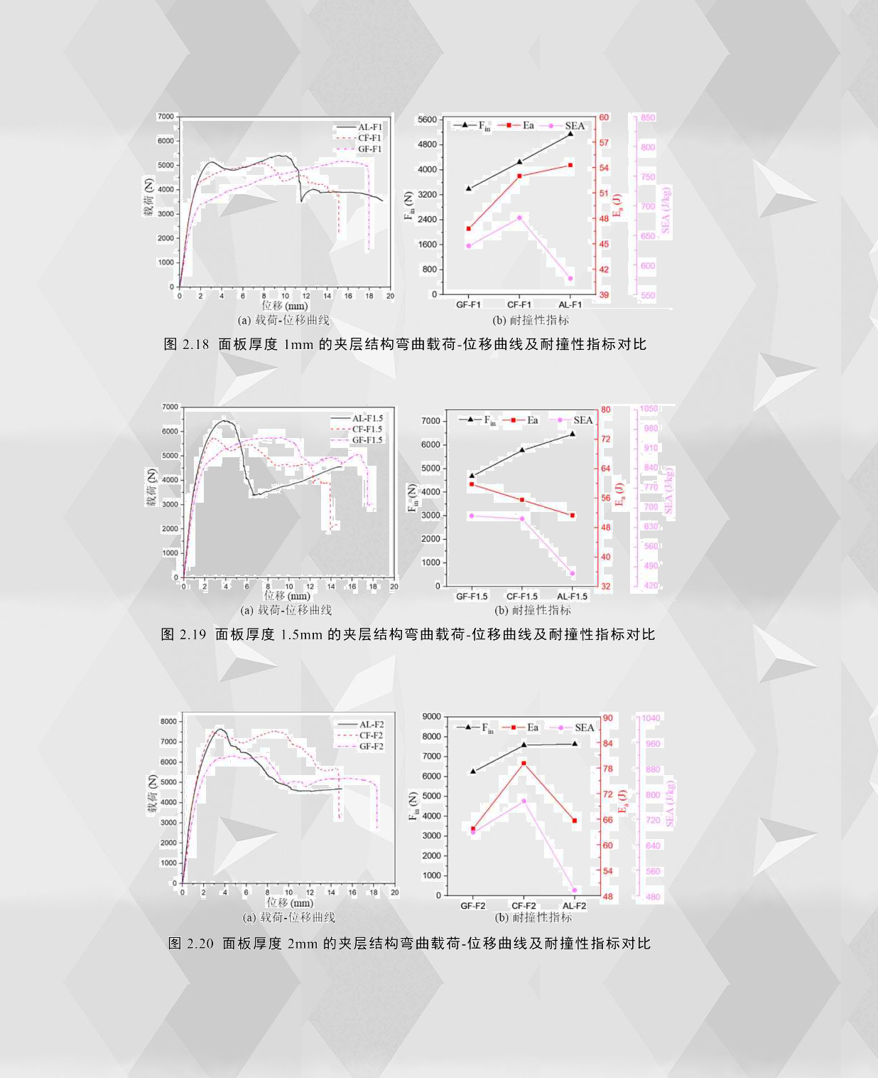 2.4.1面板對結(jié)構(gòu)耐撞性能影響——F為了研究面板材料在彎曲工況下對夾層結(jié)構(gòu)力學(xué)性能的影響,比較了同一厚度下不同面板材料的夾層結(jié)構(gòu)的載荷-位移曲線,如圖2.18(a)所示,結(jié)合壓潰失效過程分析,對面板為1mm的試件而言,試件GF-F1、CF-F1和AL-F1的臨界失效模式均為壓痕壓入(IN),但纖維增強夾層結(jié)構(gòu)與鋁合金夾層結(jié)構(gòu)不同的是,由于纖維復(fù)合材料不像鋁合金那樣有明顯的塑性變形,試件達到臨界失效時,前者的面板發(fā)生了彈性變形,后者發(fā)生塑性變形,前者載荷達到臨界載荷時會繼續(xù)增大,只是增加幅度有所減小,而后者載荷會減小。試件GF-F1在斷裂之前,未出現(xiàn)明顯的芯層剪切裂紋且未出現(xiàn)載荷下降;CF-F1后屈曲過程出現(xiàn)芯層剪切裂紋(彎曲位移約8mm處),而AL-F1后屈曲過程中出現(xiàn)界面失效和剪切裂紋(彎曲位移約10mm處),從載荷-位移曲線中可以看出在這兩處失效時,后者的載荷下降速度更快。