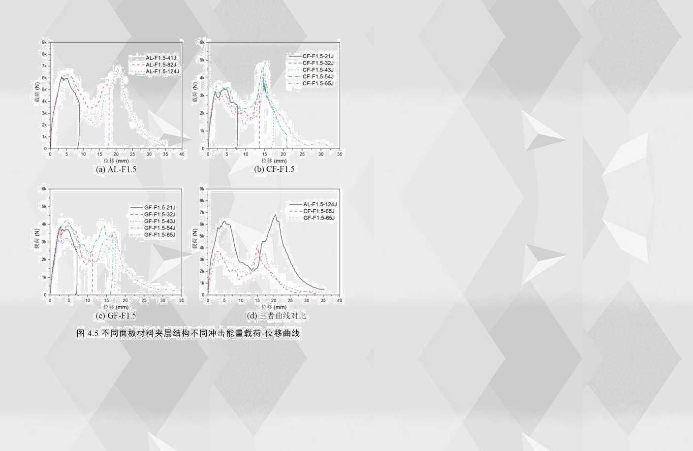 為了分析面板材料對低速沖擊性能的影響,分別對面板為鋁合金、碳纖維和玻璃纖維的夾層結構試件進行了不同能量下的沖擊試驗。4.5展示了面板厚度為1.5mm的夾層結構在不同沖擊能量下的載荷-位移曲線。三種配置的夾層結構在完全穿透的情況下,鋁合金夾層結構的載荷-位移曲線整體趨勢高于纖維增強加夾層結構。