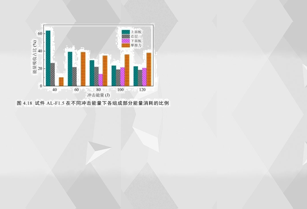 圖4.18為AL-F1.5在不同沖擊能量下各組成部分能量吸收的比例。上面板消耗的能量比例在小能量(40J)沖擊下最大(高達(dá)64%),芯層耗能占比為26.5%,因此在小能量沖擊下,增強(qiáng)上面板和芯層的防護(hù)更能提高結(jié)構(gòu)的耐沖擊性能;當(dāng)下面板完全穿透時(shí),摩擦力消耗的能量占比最高(約為38%);有趣的是,在各沖擊能量下,泡沫芯層吸能占比均在20%左右;此外還發(fā)現(xiàn),無(wú)論夾層結(jié)構(gòu)穿透與否,上面板的耗能占比均大于下面板,這說(shuō)明增強(qiáng)上面板更能提高夾層結(jié)構(gòu)的耐沖擊性。